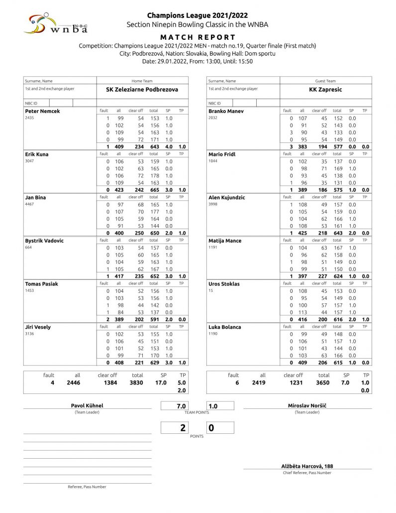 Podbrezová vyhráva v prvom Štvrťfinálovom zápase Ligy majstrov v domácom prostredí 7:1 a vybojavala si tak sľubnú východiskovú pozíciu do odvety ktorá je napláne 19.februára v Zaprešiči