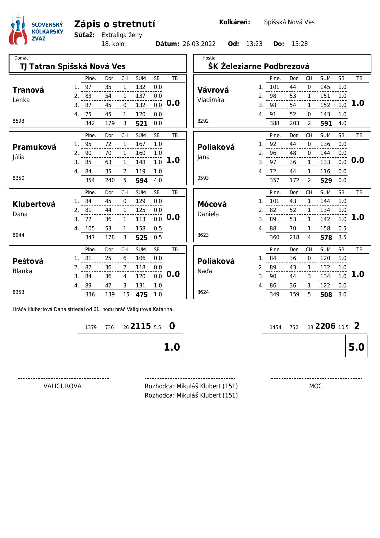 Extraliga ženy, TJ Tatran Sp. Nová Ves – ŠK Podbrezová