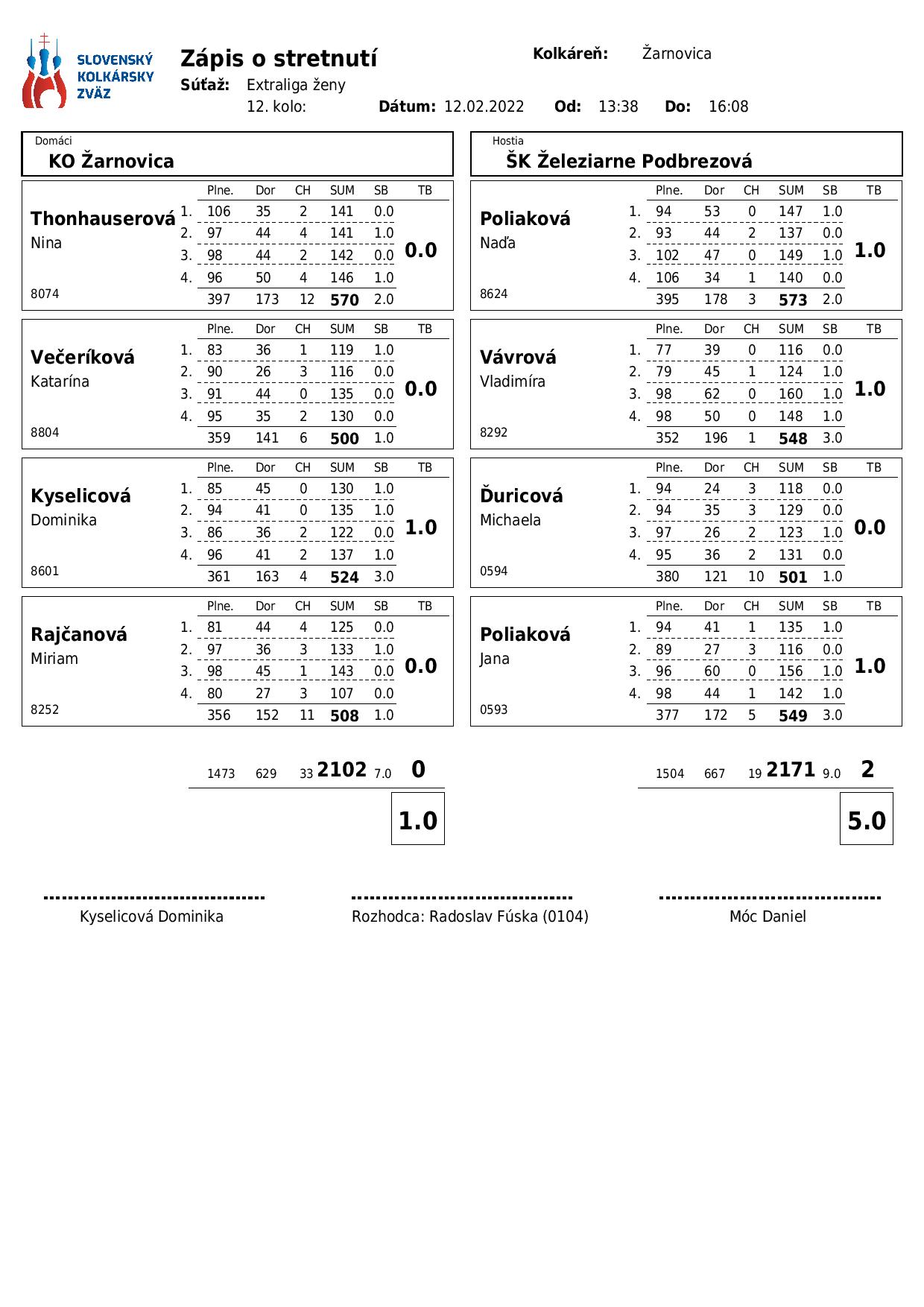 Extraliga ženy, KO Žarnovica – ŠK Podbrezová